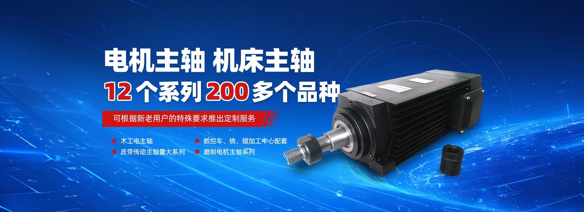 擁有現代化的電機主軸、機床主軸設計和制造技術、設備精良,品質可靠。產品有四大類12個系列200多個品種,主要適用于數控加工,高速內外圓磨削、高速鉆銑及雕刻、木工鏤銑等。數控機床主軸包括電動主軸、皮帶傳動主軸量大系列與數控車、銑、鏜加工配套。